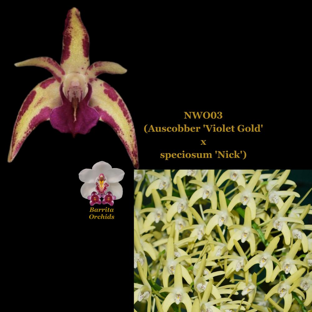 This is a captivating hybrid that flowers from late winter to spring. Producing 20–30 blooms along a gracefully arching raceme, this variety is expected to showcase a stunning blend of gold and purple hues, inherited from its Auscobber parent. With the robust form and prolific flowering habit of D. speciosum ‘Nick’, this hybrid promises both elegance and vibrancy, making it a standout addition to any orchid collection.