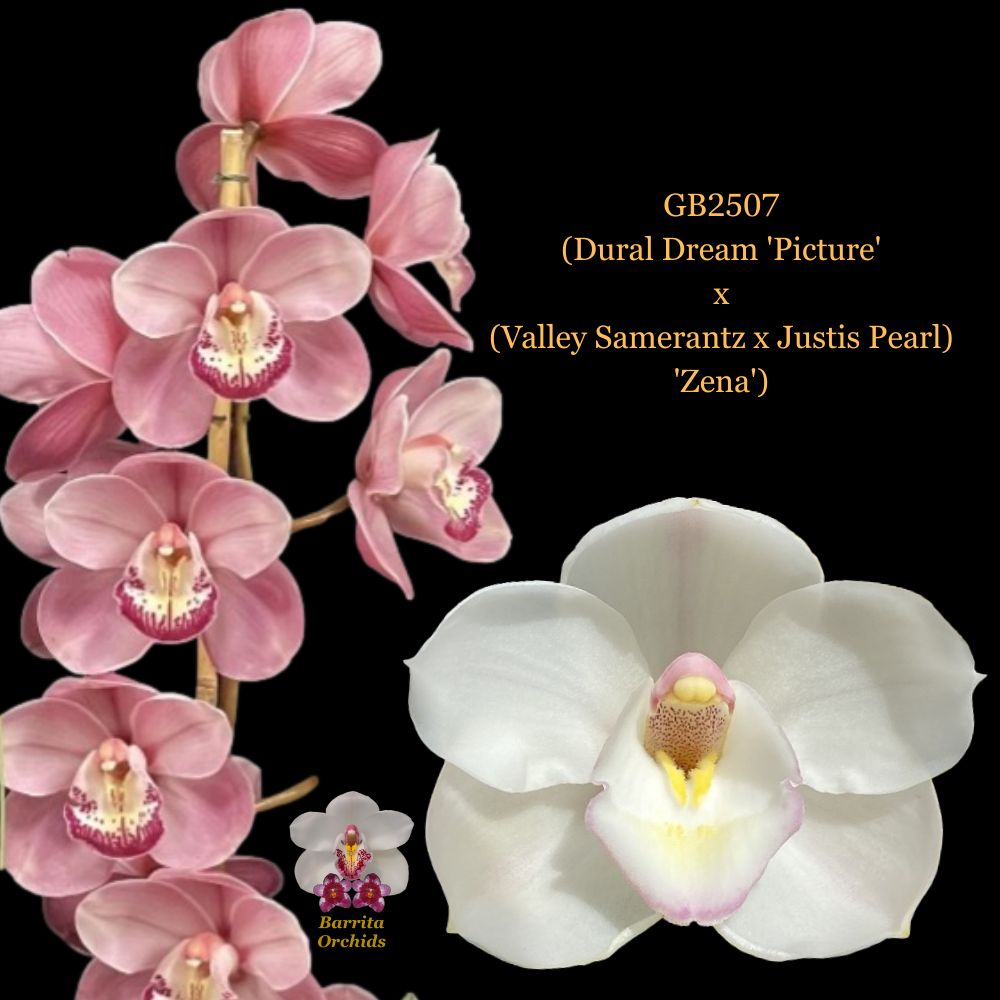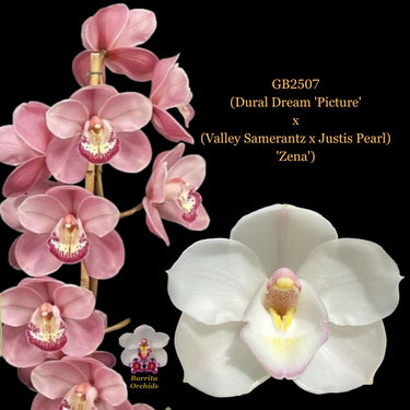 “Picture” a proven parent. Mainly soft pastel pinks, some whites expected here. Lightly marked lips. Early to mid-season. Looking for high shape and pretty pinks.