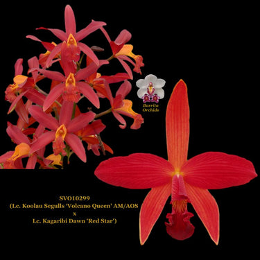 Koolau Seagulls (C. Wilbur Chang x Lc. Seagulls Milarina) 'Volcano Queen' has a very impressive flower display with 13-15 well-arranged, starry red flowers on a straight upright 2-foot-long stem. You read that right – two feet tall! Kagaribi Dawn (L. Kagaribi x Slc. Tropic Dawn) has a brilliant eye-catching red flower with a starry shape, everybody is drawn to these flowers when blooming. This cross is all about awesome-looking starry red flowers well displayed above the foliage. These plants are showing excellent upright growth habit and will be spectacular show plants when mature.