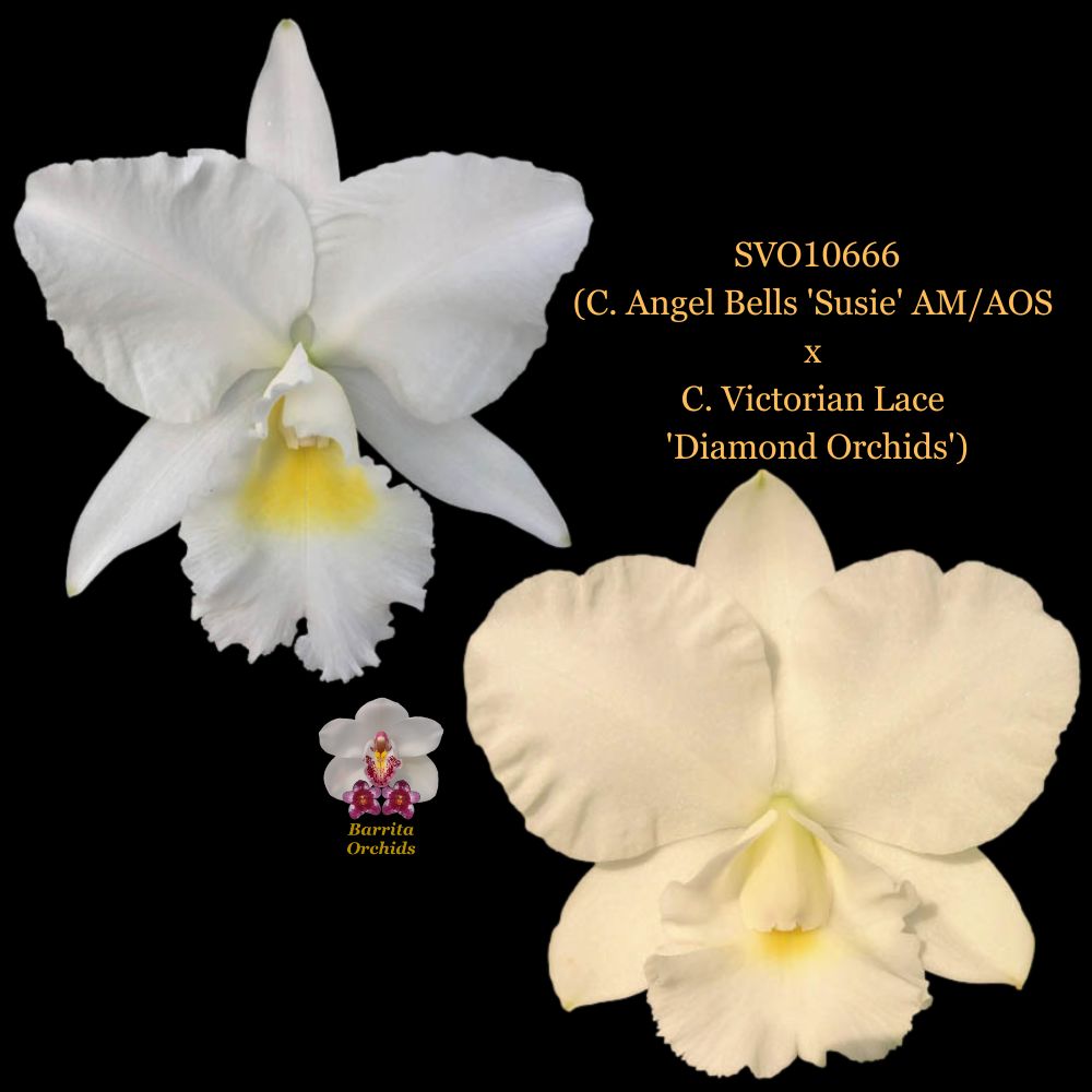 How do you breed for compact plant with white flowers? There have been many large sized plants with white flowers not so much in smaller plant forms. This cross is where we are working to achieve the goal of compact plants with white flowers (without the spade lip shape of walkeriana) Angel Bells (C. Empress Bells x C. Little Angel) is a classic white Cattleya with flowers well displayed above of the foliage, pure white and a glistening texture. Victorian Lace (C. Moon Festival x C. walkeriana) is a small plant just 6” tall, its flowers are flat and full shaped with beautiful form. We are optimistic on several fronts with this cross. The large alba flowers and of ‘Suzie’ and the small plant, shape, and alba color of ‘Diamond Orchids’ are expected to get to the goal. This is a new area in the breeding of Catts