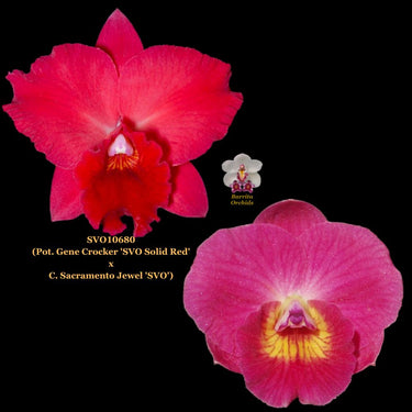 Would you like super shapely flowers in dark red? That is the goal here. Gene Crocker (Pot. Newberry Delight x Slc. Newberry Promise) has an impressive shape, colour, and a great lip. The flower of Sacramento Jewel (Slc. Tangerine Jewel x Lc. Sacramento Rose) have crazy round petals. By combining the small stature and shape of Sacramento Jewel with the colour, form, and size of Gene Crocker will give significant potential resulting in small plants, large red flowers of outstanding shape. Boom!