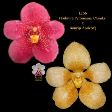 This is next-level stuff. I’ve been working on the strength of our yellow Sarcochilus. Making out crosses to improve plant vigour and lasting qualities. This cross will show the results. Kulnura Pyromania (Madge x Kulnura Hysteria) carries alba genes. While Bunyip ‘Apricot’ shows Amber characteristics. I expect chunky pattered flowers in pink and amber. Outstanding result.